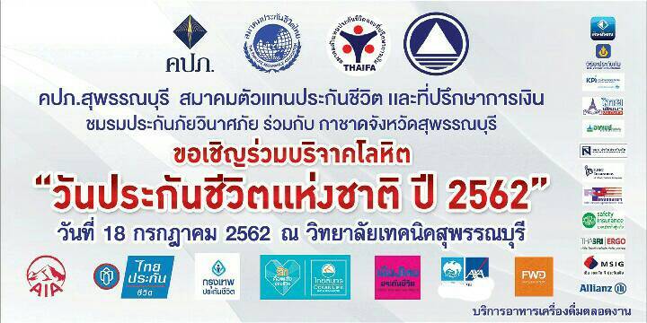 คุณธิติพันธ์ พันธโรทัยรุ่ง ผู้อำนวยการฝ่ายพัฒนาธุรกิจ และคุณณัฐพงศ์ ทองมา ผู้จัดการสาขาสุพรรณบุรี เป็นตัวแทนบริษัทฯ เข้าร่วมกิจกรรมงานวันประกันชีวิตแห่งชาติ ปี พ.ศ.2562 พร้อมสนับสนุนของที่ระลึกและน้ำดื่ม ณ วิทยาลัยเทคนิคจังหวัดสุพรรณบุรี