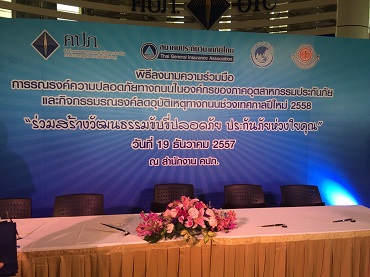 บริษัท ไทยพัฒนาประกันภัย จำกัด (มหาชน) ได้ร่วมลงนาม ในบันทึก ความร่วมมือ ตาม “โครงการรณรงค์ความปลอดภัยทางถนนในองค์กร ของภาคอุตสาหกรรมประกันภัย” ร่วมกับ สำนักงาน คปภ. สมาคมประกัน วินาศภัยไทย และสมาคม ประกันชีวิตไทย เมื่อวันที่ 19 ธันวาคม 2557 ณ สำนักงานคณะกรรมการกำกับ และส่งเสริมการประกอบธุรกิจประกันภัย